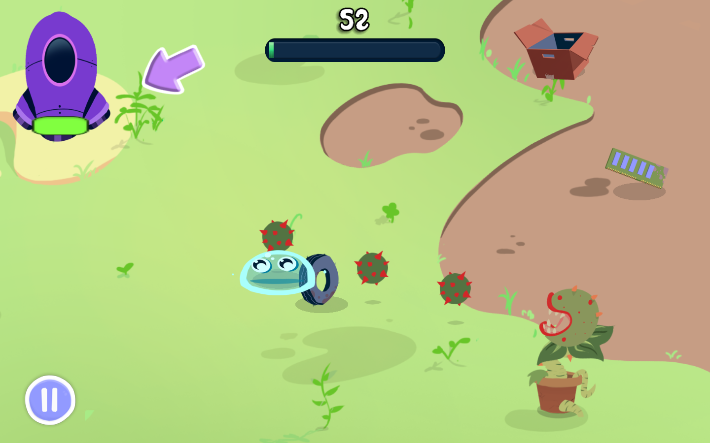 O jogo possui visão top down, de estilo 2D, sendo considerado um jogo Arcade. Em cada planeta existe um inimigo que irá tentar impedir que o slime limpe o planeta. O inimigo é uma planta carnÍvora que joga bolas de espinhos, desenvolvida através de incontáveis mutações nas entranhas do planeta para inibir possíveis invasores. Uma tentativa desesperada de um planeta doente, que tenta de todas as formas se defender. Em cada partida, o jogador tem mais ou menos 60 segundos para recolher todo o lixo e plantar algumas sementes onde não há grama, fazendo isso, o jogador poderá completar a fase e seguir para o proximo planeta. Ao completar a fase o jogador ganha uma quantia em moedas.