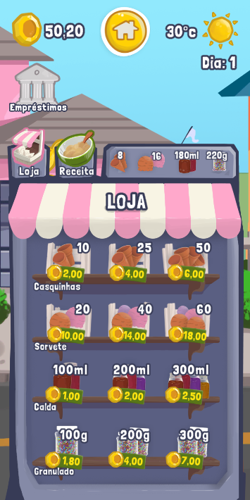 O jogador poderá comprar seus ingredientes, e ajustar a receita ao seu favor antes das vendas, isso significa que o jogador deve manter o controle do seu negócio e estoque dos ingredientes.